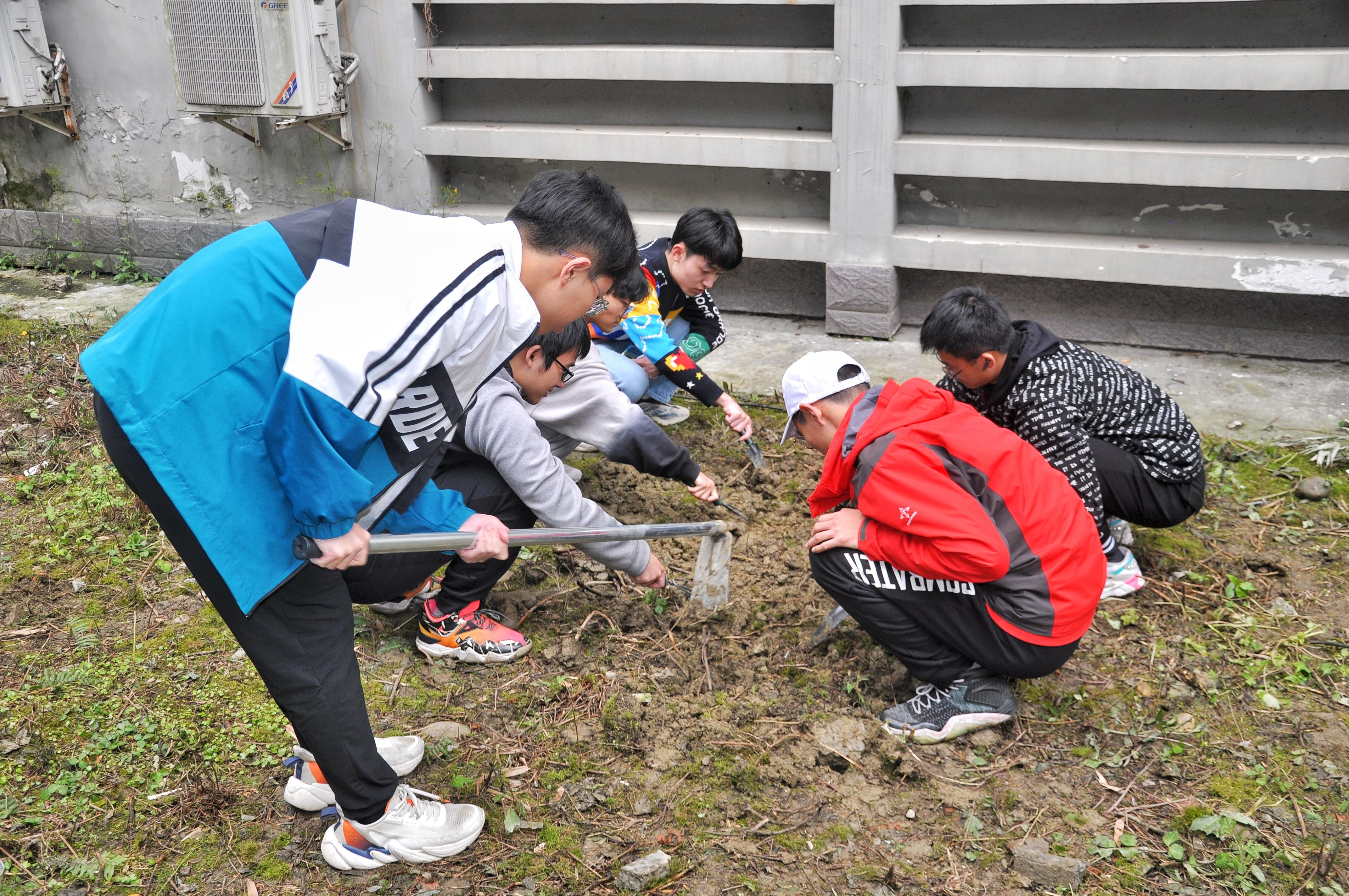 党总支书记甘霖老师和党总支副书记王霞老师亲临现场指导了大家的劳动。有了前一组同学在第一次劳动中打下的铺垫,第二组同学的松土效率提高了不少。在同学们积极的分工合作配合下,对泥土进行松土、播种、浇水的任务很快就完成了。