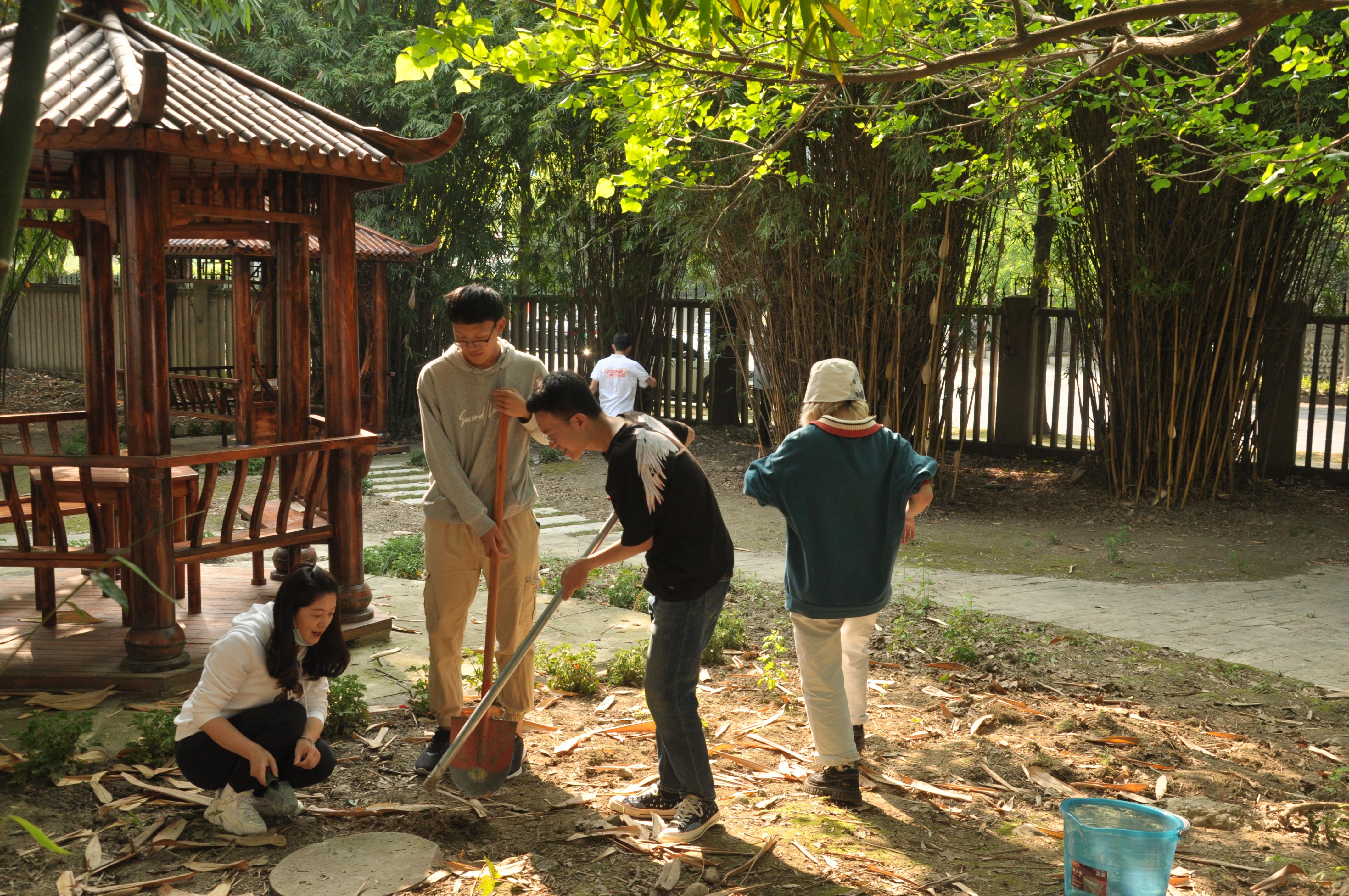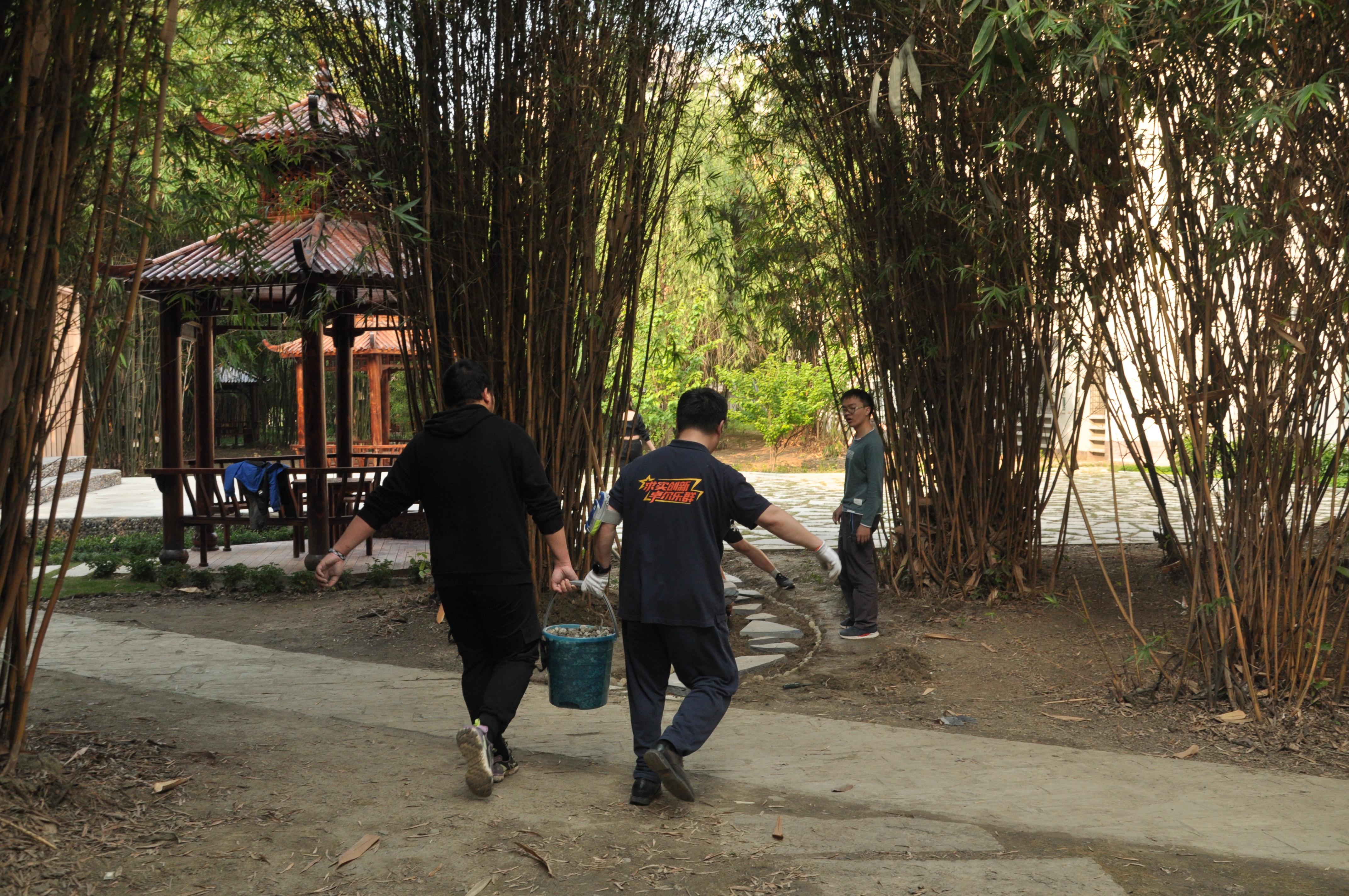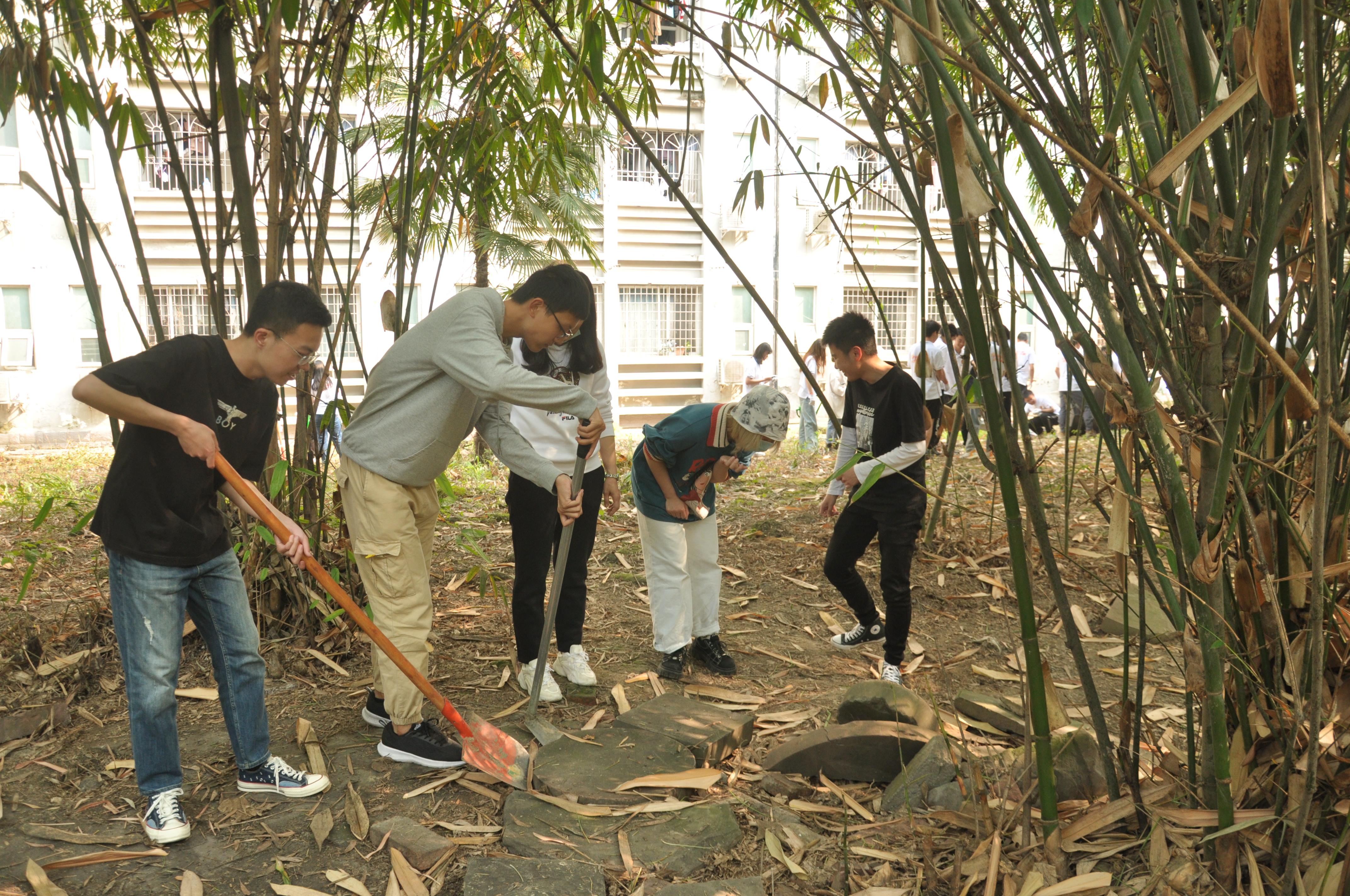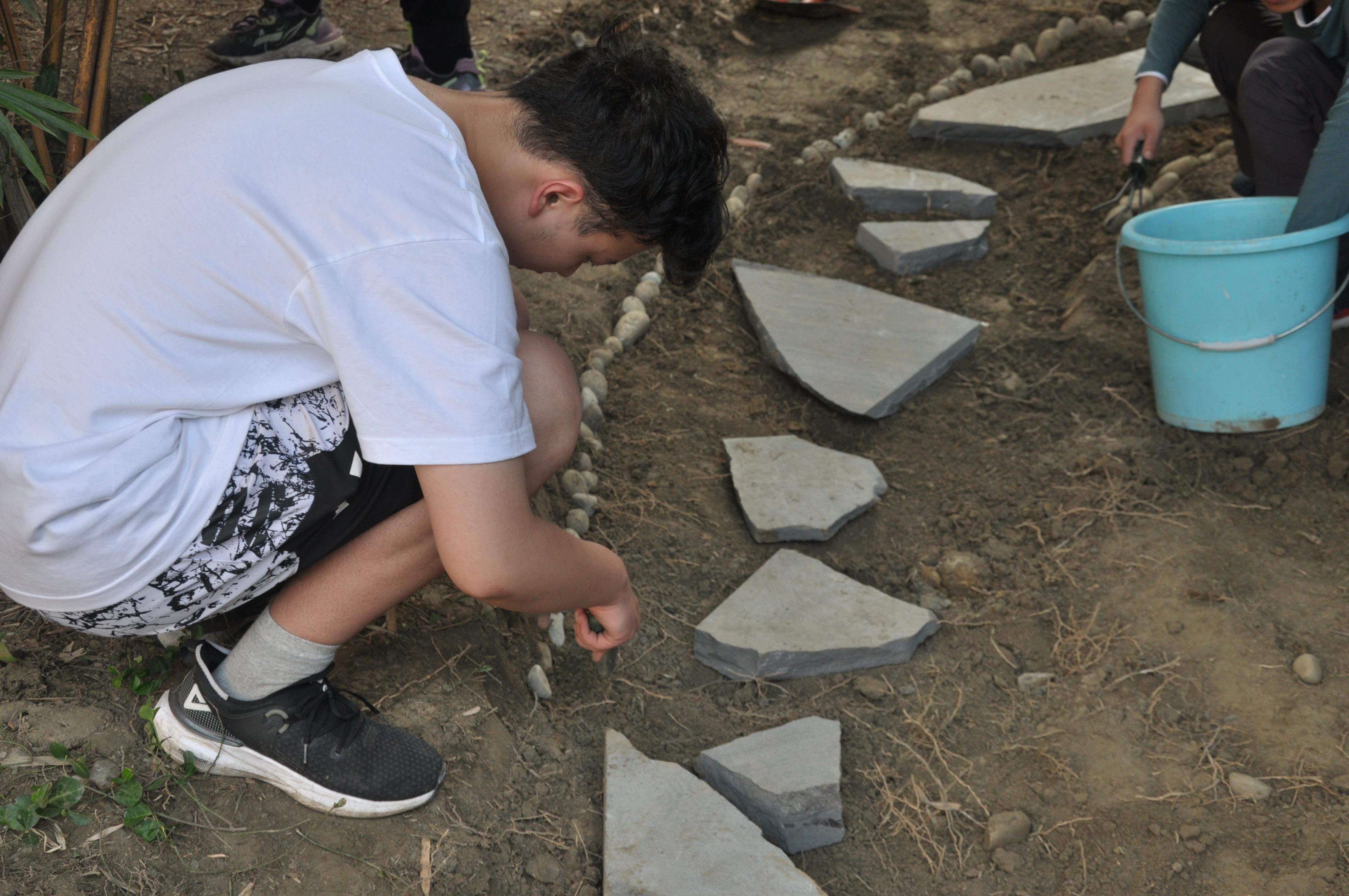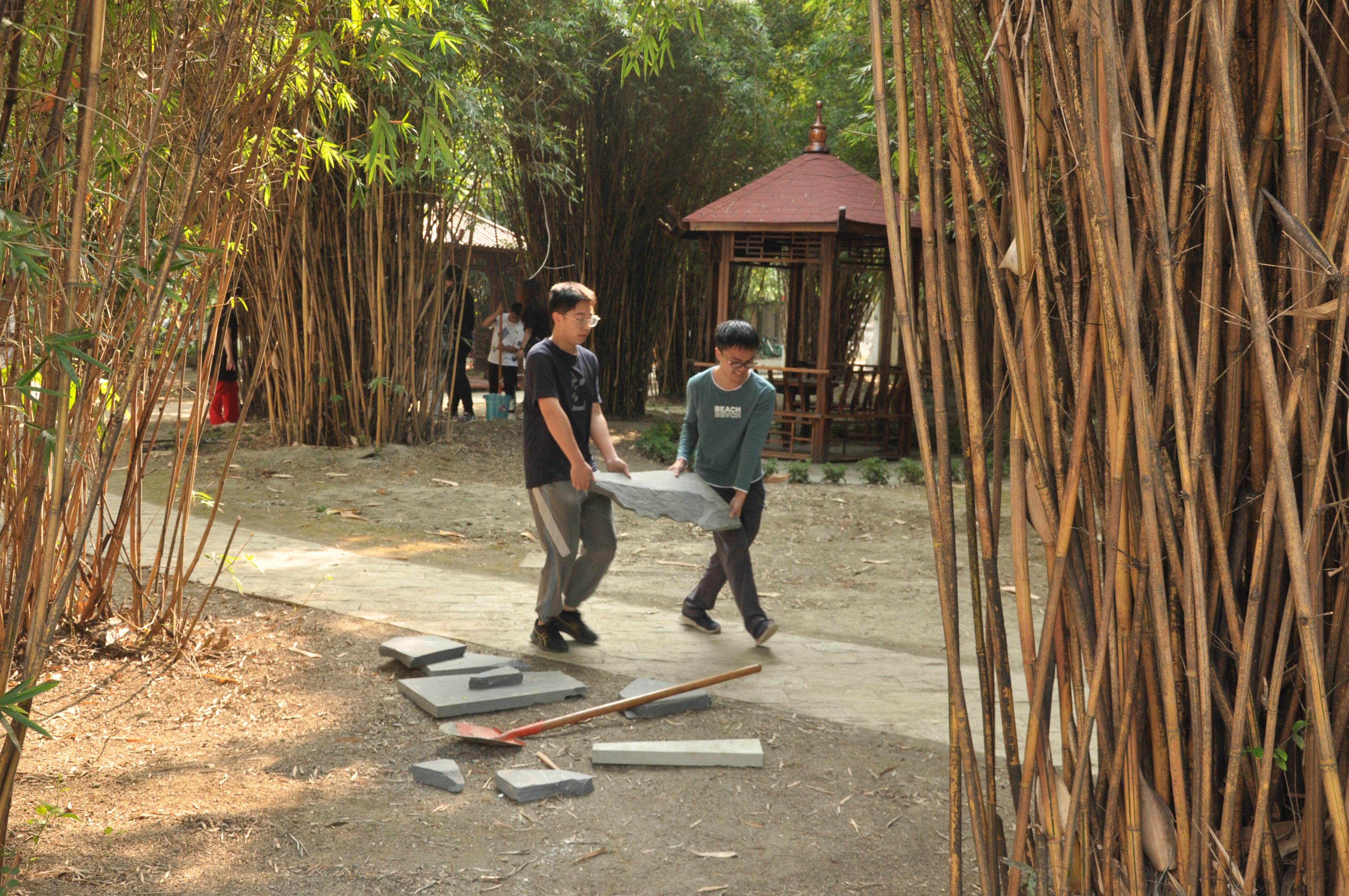 由于每个小组铺设小径各有不同,所需解决的问题也不同,同学们身体力行,集思广益,积极完善本组的小径铺设方案,就地取材,利用书院周边的建筑边角料来铺设小径。有同学负责挖掘小路雏形、有同学负责捡拾鹅卵石、有同学负责清理青苔、有同学负责搬石板……大家合理安排,分工合作,忙得不亦乐乎、乐在其中,材料收集和路径开凿同步进行,大大缩短了铺设所需时间。随着时间的推移,小径初具雏形,尽显同学们的审美力和创造力。