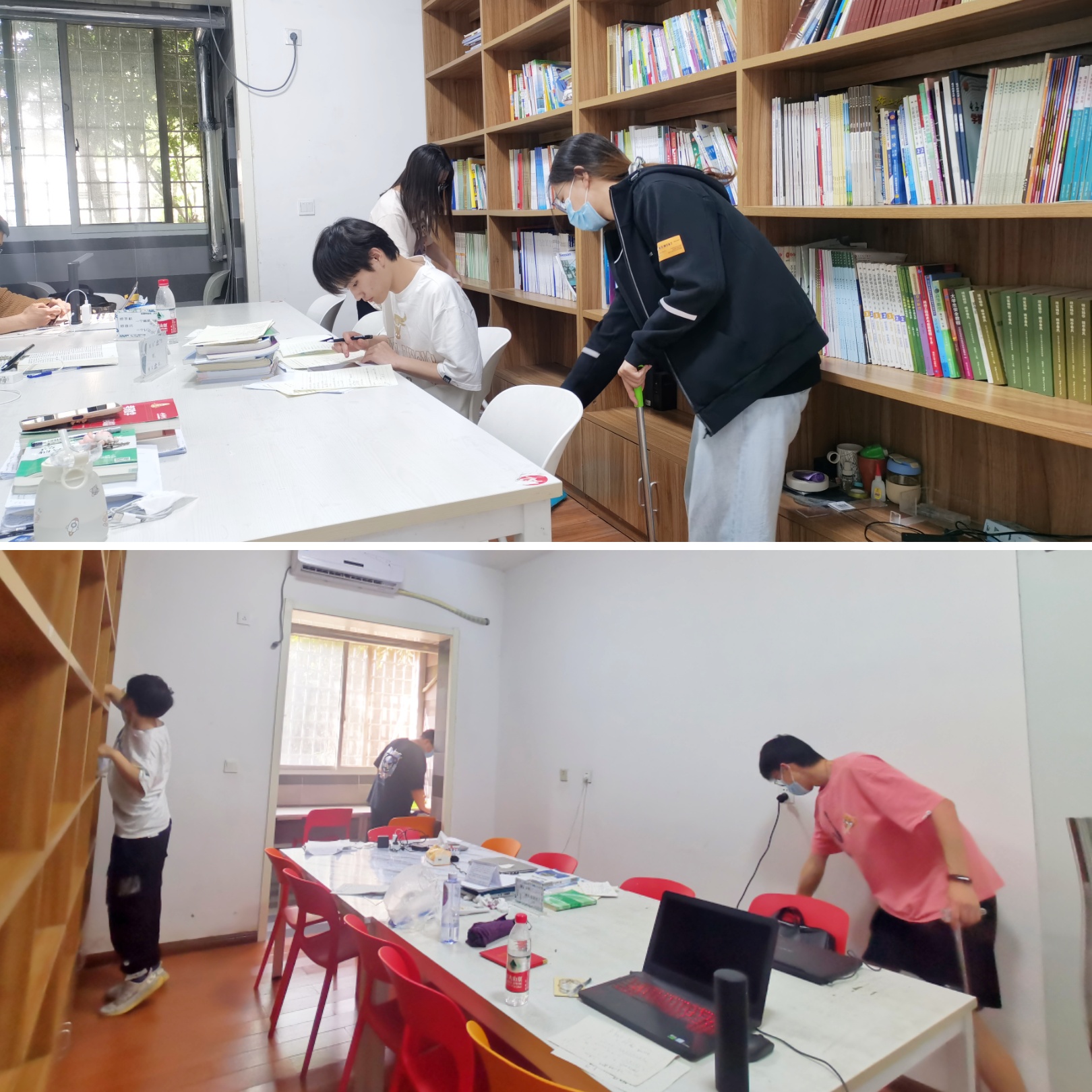 巫雪梅老师首先为大家规划打扫范围,并分配劳动工具。同学们根据分配工作,积极劳动,擦桌子扫地拖地、整理桌椅,在近一个小时的忙碌后,书院一楼研学室打扫得干净整洁。