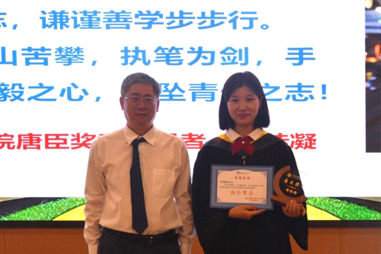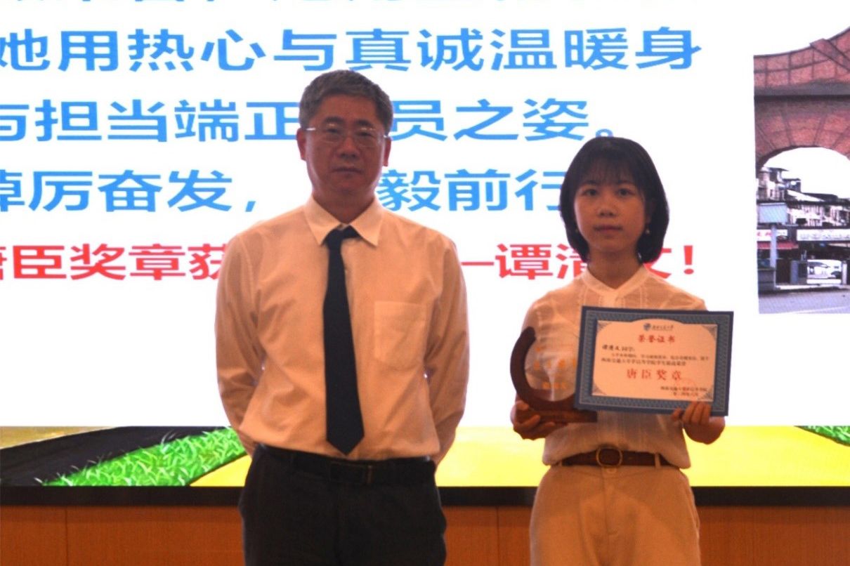 常务副院长崔凯宣读学院2024届学生最高荣誉“唐臣奖章”表彰文件,并由康国政院长对7位获得“唐臣奖章”的毕业生颁发奖杯及证书。