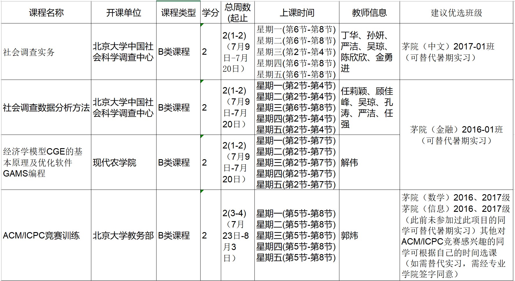 2、关于暑期实习替代:1)茅院(金融)2016-01班、茅院(中文)2017-01班、2016级、2017级信息班和数学班,未参加过此项目的学生如选择上述建议课程已获得专业学院批准同意替代相应实习。2)其他专业学生选课如需替代实习,需经专业学院签字同意。3)申报北京大学暑期学校项目未经专业学院同意替代暑期实习的,作为自愿参加项目,返校后需补修学校安排的暑期实习。