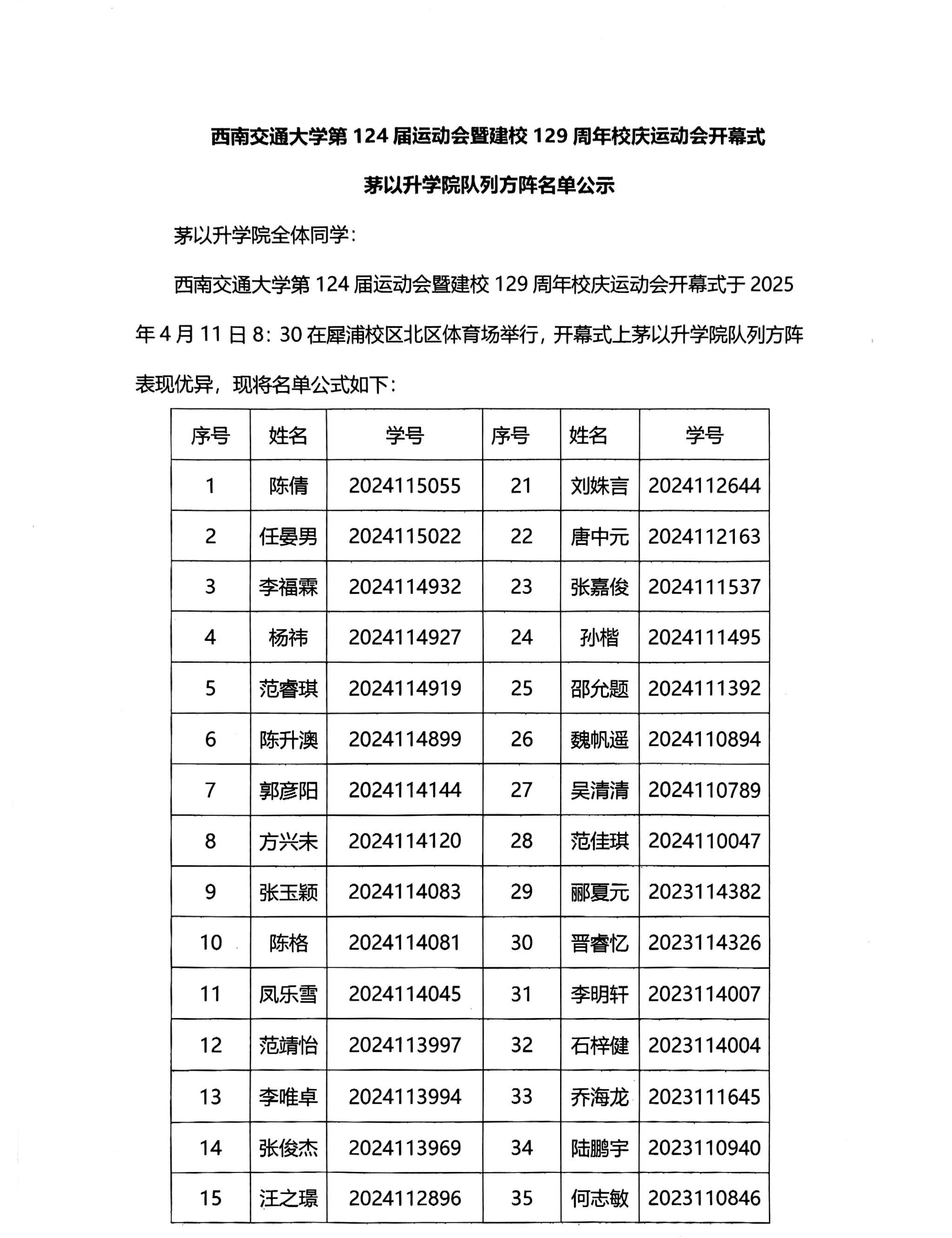 【公示】中文成人网 第124届运动会暨建校129周年校庆运动会开幕式中文成人网 队列方阵名单公示