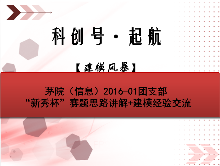 2017年11月22日,茅院(信息)2016-01团支部于唐臣书院2楼举办了科创号·起航特色团支部活动之【建模风暴】,在新秀杯比赛进行地如火如荼之际,本次活动在响应党和学校号召,建设特称团支部的同时,主要针对“新秀杯”赛题思路进行讲解并对建模经验进行交流。