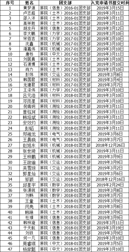 为进一步做好入党积极分子培养发展工作,增强党员发展工作的民主程度和透明度,广泛接受群众监督,保证党员发展的质量,按中文成人网 党总支要求,特将2018-2019学年第二学期的入党申请人名单公示如下: