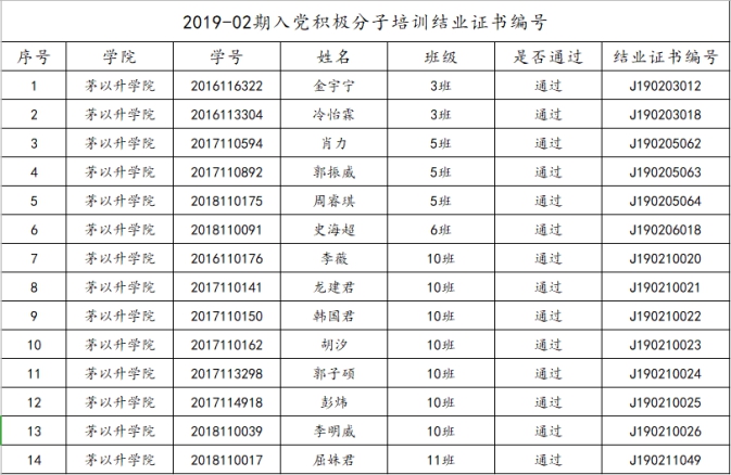校党委党校开设的2019-02期入党积极分子党课教育培训班的集中辅导、社会实践等各环节均已结束,入党积极分子党课教育培训班已经圆满结业。现将本期入党积极分子党课教育培训班成绩合格,准予结业的名单公布如下: