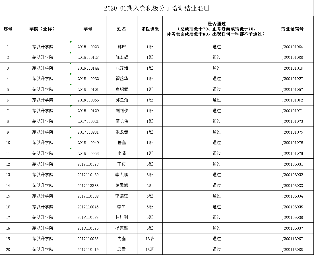 校党委党校开设的2020-01期入党积极分子党课教育培训班的集中辅导、社会实践等各环节均已结束,入党积极分子党课教育培训班已经圆满结业。现将本期入党积极分子党课教育培训班成绩合格,准予结业的名单公布如下: