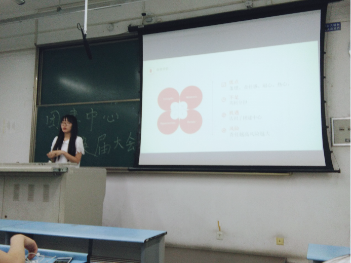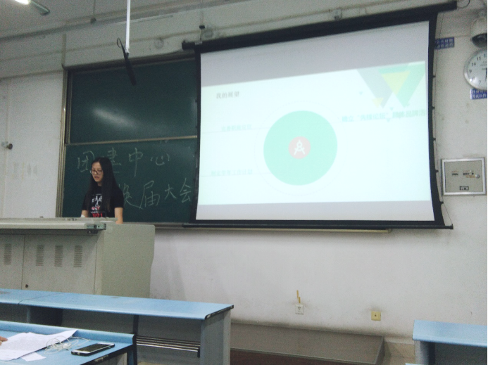 第二位候选人是来自15级数学班的苏惠萍,她的宣讲包括工作回顾、自我评价、工作体会和目标展望四个方面。她先对两年来自己在团建中心的工作做了总结,接着从多个方面进行了自我评价,并从责任感、效率、传承三个方面讲述了她的工作体会,最后从加强交流的角度传达了她对未来工作的展望。
