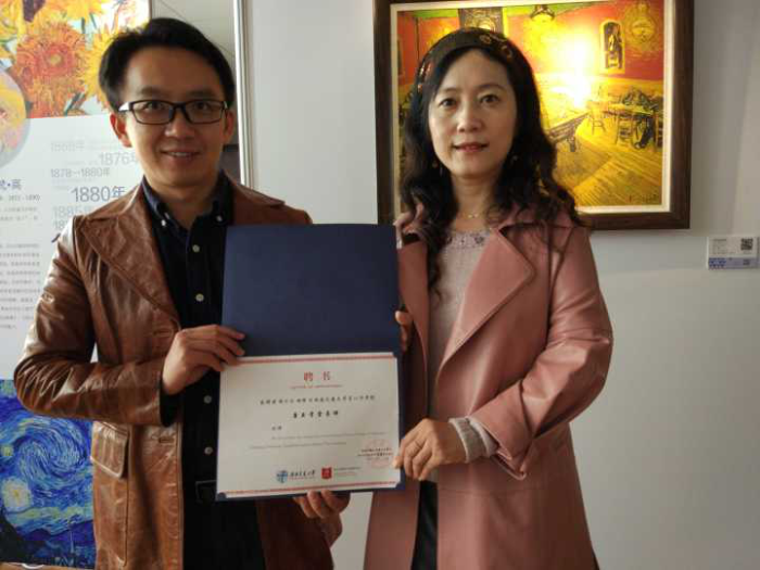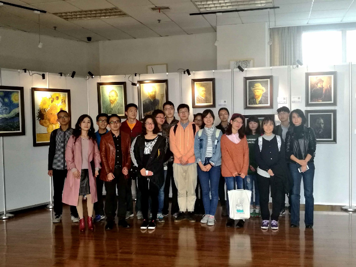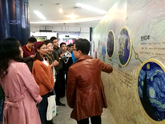 随后是主展厅的讲解,同学们跟随舒老师走进了陈列梵高作品的独立展厅,和这位传奇人物近距离接触。无论是闻名遐迩的《星月夜》、《包扎耳朵的自画像》,还是不那么为人所熟知的《吃土豆的人》,同学们都能从其中读到梵高苦难坎坷的人生,以及他不刻意寻找美好的随性自然。同时从《向日葵》那金黄跳动的鲜艳笔触里,同学们也能够感受到纯粹源于艺术的热情与生命的张力。在该展厅参观结束后,图书馆读者服务部处长刘文华向舒老师颁发了唐臣学堂导师荣誉证书,并合影留念。