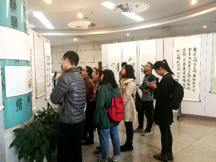 大学生及教职工书画协会作品展。舒老师通过对《清明上河图》等历史名画,及黄庭坚与林风眠等大家的介绍,让所有人重温了中国传统书画的意蕴。在书画展里,舒老师以书法作品为例,从或苍劲或连贯的笔法中,为同学们解读出“形断神连”和“笔断意连”等哲学思想。