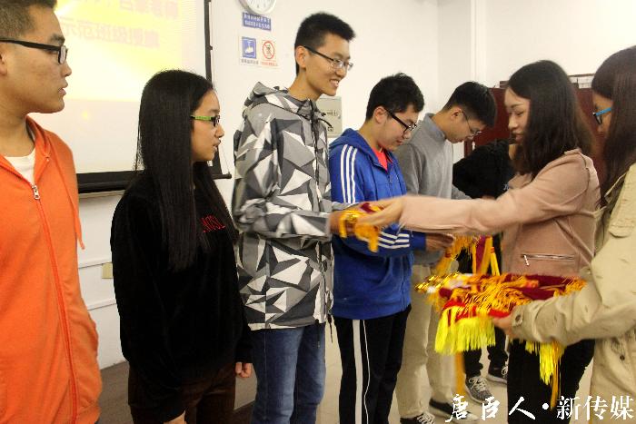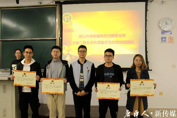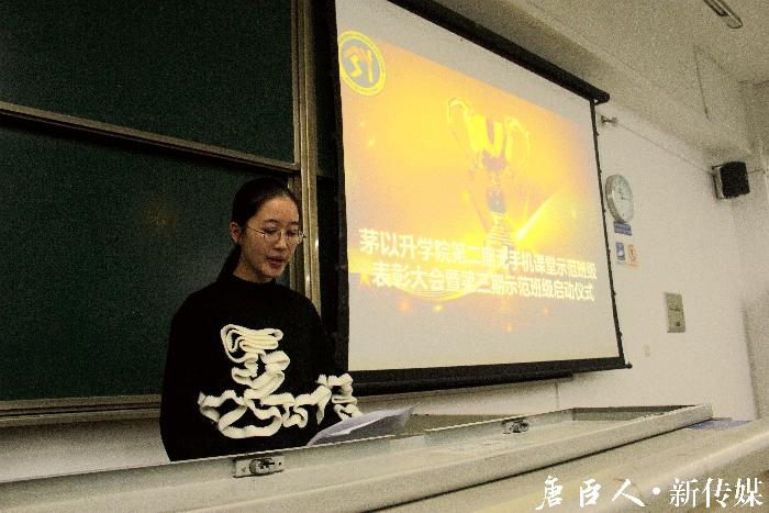 随后王霞老师宣读表彰决定。在第二期无手机课堂示范班活动顺利完成任务的茅院(测绘)2015-01班、茅院(力学)2016-01班、茅院(金融)2016-01班、茅院(交运)2016-01班、茅院(信息)2016-01班6个班级授予“无手机课堂示范先进班级”称号茅院(金融)2015-01班、茅院(力学)2015-01班、茅院(材料)2015-01班,茅院(土木)2015-01班授予“无手机课堂示范优秀班级”称号。获得荣誉称号的各班级代表依次上台,由刘曦睿老师颁发荣誉奖状。