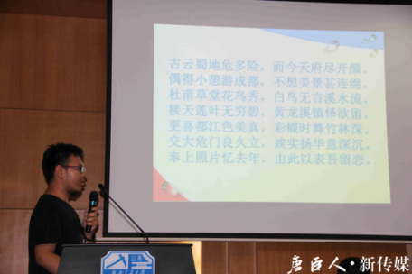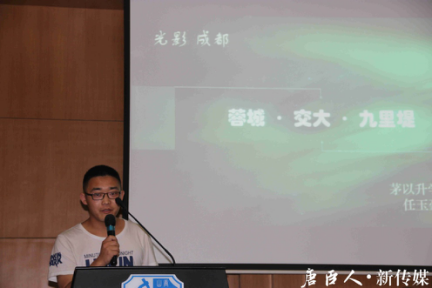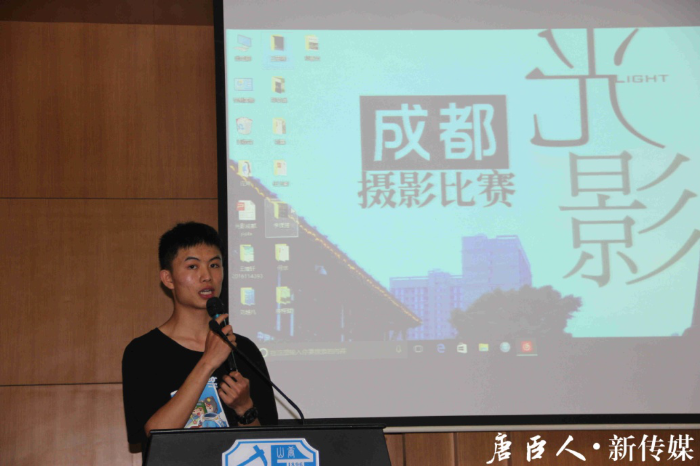场上观众对李佳蔓老师的致辞报以热烈掌声。随后,比赛进入第一个环节——“我与摄影”。每位参赛者依次登台,阐明自己对比赛主题的理解,讲述作品故事。第一位选手,来自地球科学与环境工程学院的王博轩展现了一组题为“最爱蜀地行不足”的组图,并用自创的七言古体诗述说了图片故事。第二位选手何非同样来自地球科学与工程学院,他以一个浙江人的角度,观察蓉城的独特。阡陌巷弄里的生活气息、历史悠久的三人麻将都给他留下了难忘的记忆。来自建筑与设计学院的唐程璇从专业角度阐述了她所提交作品的构图方法。方法技巧之外,驻足都江堰鱼嘴的她也真切体会到了“逝者如斯夫,不舍昼夜”的精神内涵。第四位选手是来自中文成人网