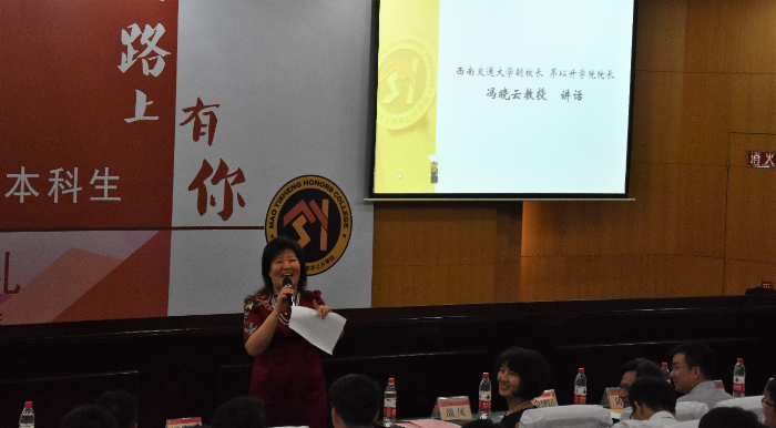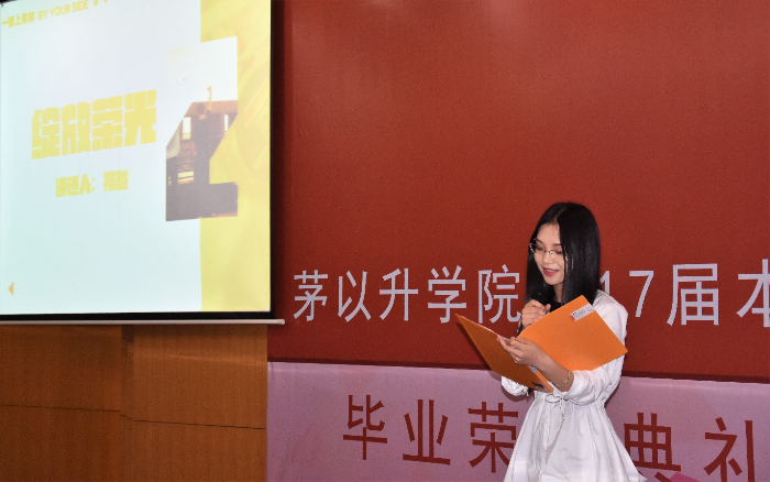 接着,冯晓云院长上台致辞,“我今天这身衣服美不美?”“美!”冯院长从自己的衣着讲起——这是她第二次穿上这身华丽的裙装,上一次穿着是在她女儿婚礼。“我们茅院2017届的同学毕业,就好像我自己的女儿出嫁一样,所以我今天专门穿了这件衣服。”冯院长深情地说到,她既表达了对同学们的不舍,也送上了美好的祝愿。同时,她还从思齐、思辨、思情三个方面出发,告诉同学们要向优秀的大家看齐,让优秀成为一种习惯,成为茅以升先生的传人,成为国家的栋梁,为社会作出贡献;不能安于现状,人生是螺旋形上升的,会遇到各种各样的困难,要求新求变求发展;同时,要学会做人,要成为有大爱的人。