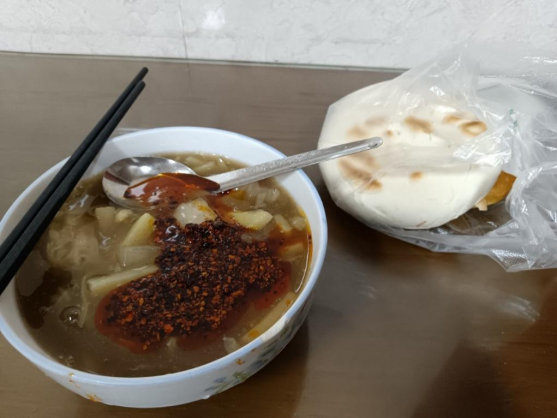 几家牛肉饼店面前都排起了长队。想必这些店铺都是本地人遴选过后的精华吧。我随意挑了一家店,要来一碗肉粒胡辣汤就着白馍吃,美美的一勺油泼辣子!手上提着茉莉冰豆浆和牛肉饼,好巴适!