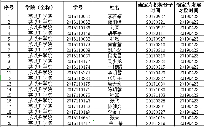 为进一步做好2019-01期入党积极分子培养发展工作,中文成人网 严格按照校党委要求,在学院党总支的领导下,经培养考察、民主推荐、党支部讨论确定,报校党委组织部审查批复,拟将李若靖等20位同学作为党员近期发展对象。为增强党员发展工作的民主程度和透明度,广泛接受群众监督,保证党员发展的质量,特公示如下: