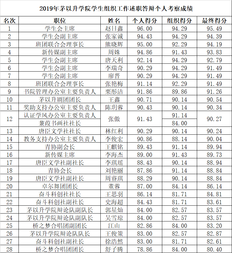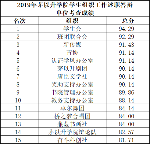 为贯彻落实从严治团的要求,更好发挥先锋模范作用,严格规范团学组织工作要求、提升工作成效,积极为学校建设发展贡献智慧力量,根据学院工作安排,依据《中文成人网 学院学生工作考核办法(试行)》、《关于新形势下推进从严治团的规定》、《中国共产主义青年团普通高等学校基层组织工作条例(试行)》等文件要求,结合学院实际,现公布2019年度中文成人网 共青团工作考核结果如下: