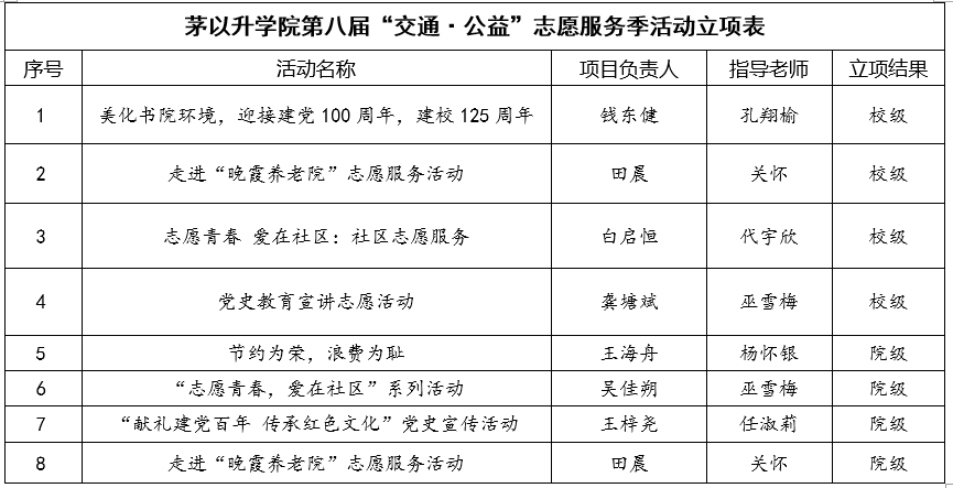自第八届“交通·公益”志愿服务季活动发布申报通知以来,各团支部积极申报、提交材料,经青年志愿者协会汇总、学生工作组初审,学校“交通·公益”志愿服务季活动工作小组审核。综合考虑活动的可行性、策划的完整性、创新性、专业特色等标准,最终遴选出7项活动立项,现将立项结果公示如下: