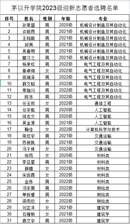 2023级迎新志愿者选聘通知》,经自主申报、审核信息等环节,选聘出31名同学担任2023级学生迎新志愿者职务;同时,根据专业学院2023级中文成人网