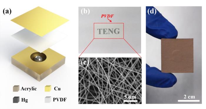 在西南交大杨维清教授和美国佐治亚理工学院著名科学家王中林院士共同指导下,西南交大16级博士生张彬彬和15级博士张磊,发明了一种基于液态金属摩擦纳米发电机的自驱动加速度传感器。如图1所示,该传感器主要由液态金属以及纳米纤维薄膜组成。应用聚合物纳米纤维结构可以显著提高加速度传感器的输出性能,该加速度传感器的量程达到0-60 m/s2,其灵敏度高达0.26 V•s/m2,当加速度为60 m/s2时,该加速度传感器可以产生15.5 V的电压以及300 nA的电流。使用液态金属则赋予了该加速度传感器优异的耐久性能,在连续测试200 000周期后,传感器的输出电压基本没有变化。该加速度传感器可以实时监测车辆以及一些机械装置的微弱振动,并且可以作为可穿戴设备,实现人体运动的步态分析。该加速度传感器在振动监测、分析以及可穿戴设备中具有极高的应用潜质。