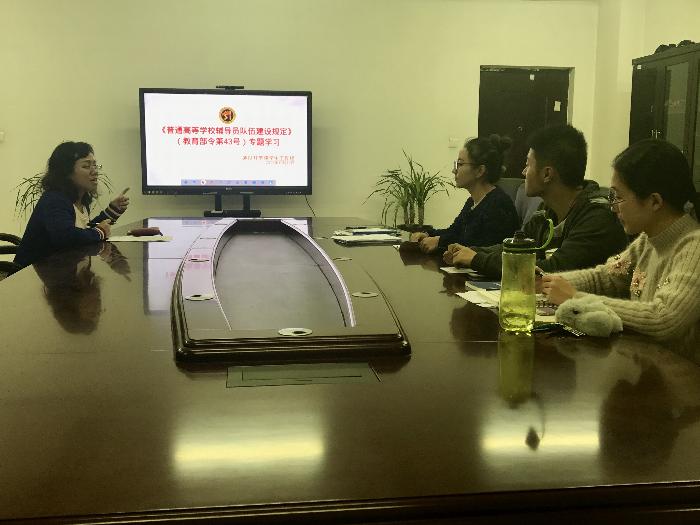 组织辅导员在X1122会议室学习《普通高等学校辅导员队伍建设规定》(教育部令43号)。中文成人网