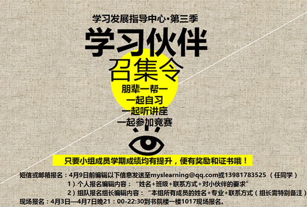 1、欢迎并鼓励同学们按照规则自行组成“学习伙伴”小组并向学习发展指导中心报备;