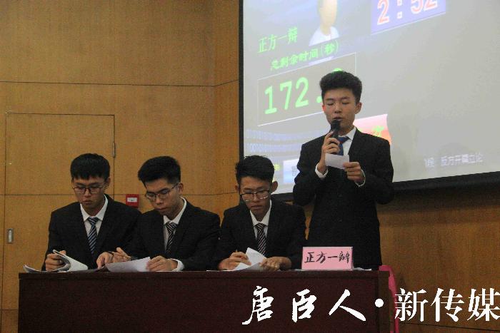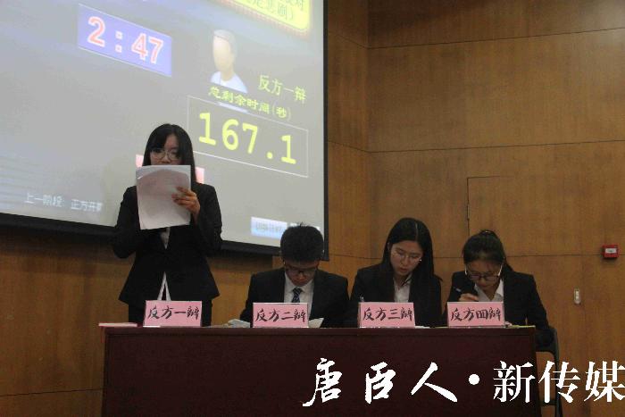 比赛进行到最为激烈的自由辩论环节,正方先声夺人,紧扣反方论据的漏洞进行质询;而反方改变强攻战术,等待时机,针对正方言语中的矛盾与纰漏进行反攻。一辩一答间,尽显茅院学子昂扬风采。