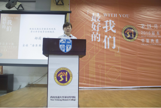 党总支高平平书记走上舞台,隆重介绍了前来参加本次毕业荣誉典礼的领导及嘉宾,并向2016届毕业生同学们送上了自己诚挚的祝福。