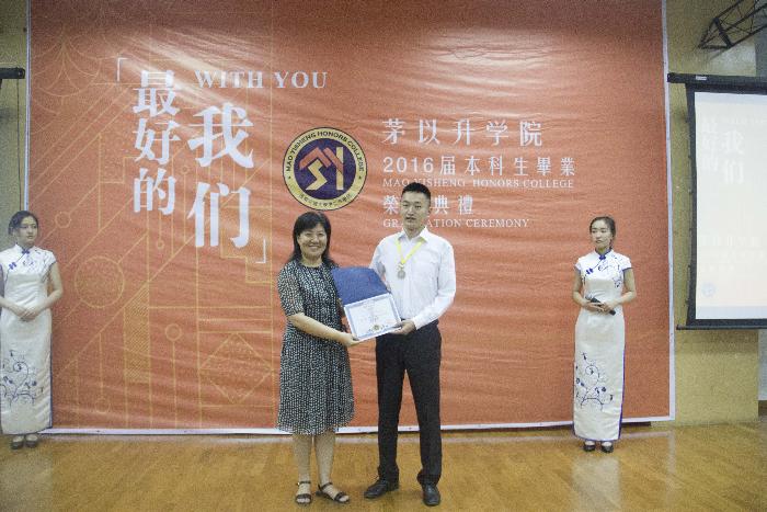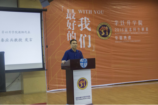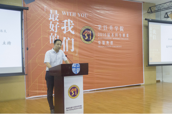 2012级“最奇葩”“最牛”“最爱自拍”同学的照片逐一出现,台下顿时热热闹闹地,满是欢声笑语,当各班的集体照缓缓闪过,典礼现场倏地安静了下来,同学们或沉思,或微笑,都回忆着过往的种种。随后,2015唐立新优秀教师奖获得者——秦应兵老师应邀发言,赢得掌声连连。毕业生代表,来自2012级茅信的时任学生会主席——王萌抒发了他的交大情怀,满含深情地讲述了从进入中文成人网