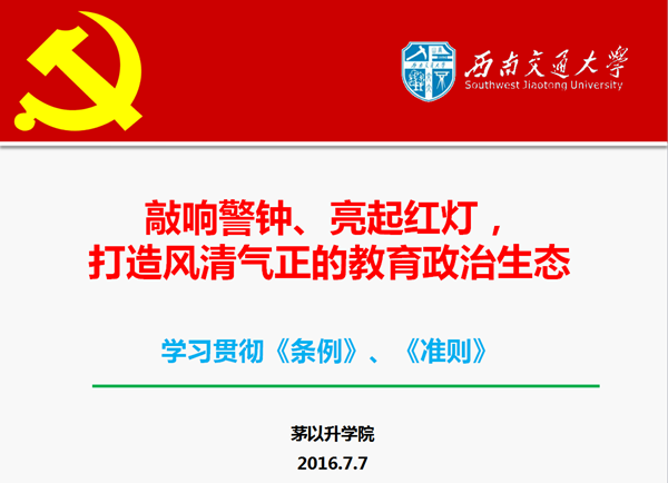 高书记首先为与会党员做了《敲响警钟、亮起红灯,打造风清气正的教育政治生态——学习贯彻< 条例>》的报告。报告就《条例》的修改背景、重点解读、重要意义以及如何扎实践行贯彻《条例》进行了详细解读。高书记指出中共中央发布《中国共产党廉洁自律准则》和《中国共产党纪律处分条例》是党中央在新形势下推进全面从严治党的新的历史标注和治本之举,《中国共产党纪律处分条例》开列了“负面清单”,“六大纪律”划出了党组织和党员不可触碰的底线。随后高书记对政治纪律、廉洁纪律、组织纪律、群众纪律、工作纪律和生活纪律的主要违纪行为进行了深入的解读和举例说明,并详细讲解了六大纪律“负面清单”的新提法以及纪律处分的种类、措施和规则进行了讲解。他说《条例》彰显了一种坚强决心,树立了一条道德高线,厘清了一份负面清单,同时也传递了一个明确信号,通过制度的刚性和建设性力量,真正实现让党员干部从“不敢腐”到“不能腐”“不想腐”。广大党员干部要深入学习,强化认识,敲响警钟、亮起红灯,切实把政治纪律、政治规矩放在首位,打造风清气正的教育政治生态。