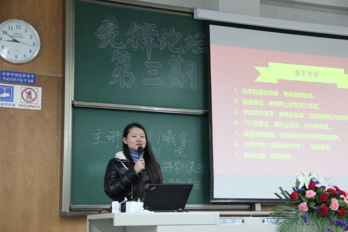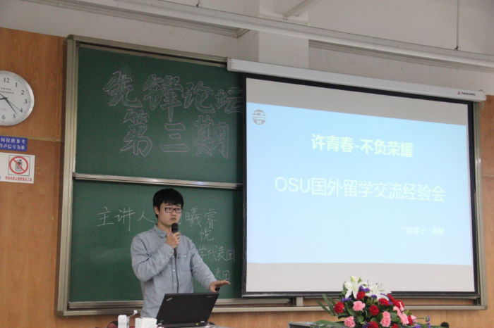 第二部分是由去年的学长学姐组成的游学交流小组为大家分享游学时的感悟,分别讲述了台湾新竹交通大学的游历生活和美国俄克拉荷马州立大学(OSU)的学习生活。各位在座的同学们从中受益匪浅,并对即将到来的暑期游学项目充满期待。