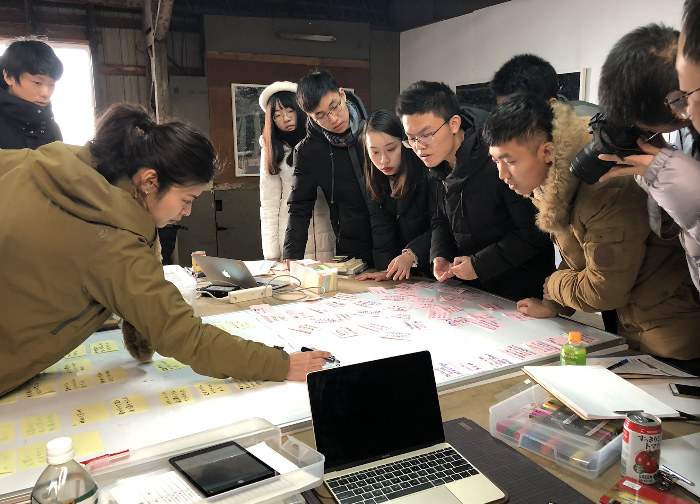 Workshop拉开序幕后,白石老师邀请一位看板设计师为同学们讲解了日本看板文化史和百年变化史,通过分享到达体验、整合看板要素、实地环境考察和个人创意讲解等环节让每一位同学都成为了“设计师”。“不论大家的创意最终是否被采纳,每一位同学的想法都是同样珍贵的。”白石老师如是说到。思维的碰撞让语言不再是障碍,中、日、英三语外加肢体语言,让workshop全过程充满了创意与欢乐。