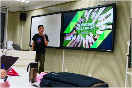 李君、王子昂、洪宇超、曲植、李宇轩组成的小组作为2017年“微”可持续性校园团队之一,其课题是“场地植物种植”。组长李君从设计方案、进度安排、经费支出、和实施细节四个方面介绍了小组课题项目的具体细节。接下来,该组将继续投入到场地内植物的种植和养护,并号召更多茅院学子参与可持续项目,接触大自然。