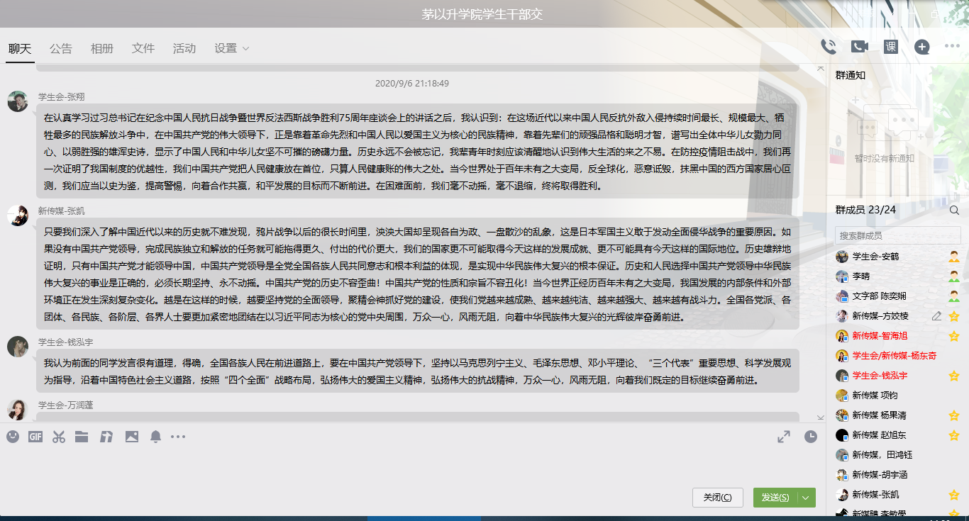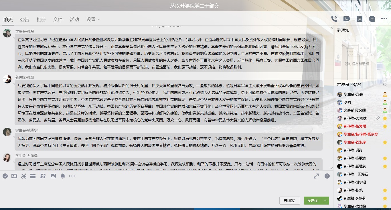学生干部成立学习小组,组织小组成员学习习近平主席在纪念中国人民抗日战争暨世界反法西斯战争胜利75周年座谈会上重要讲话精神,传承抗战信念,激励时代进步。活动以线上形式进行,由中文成人网