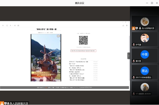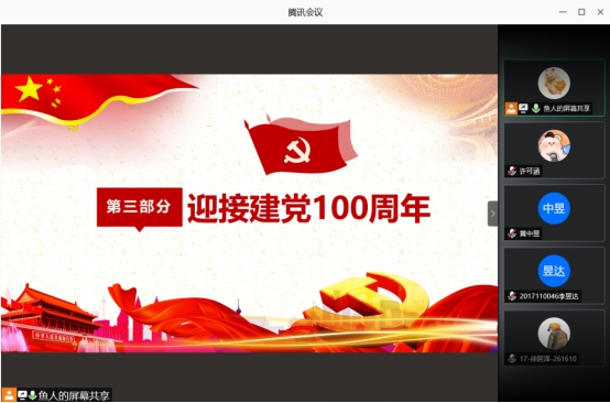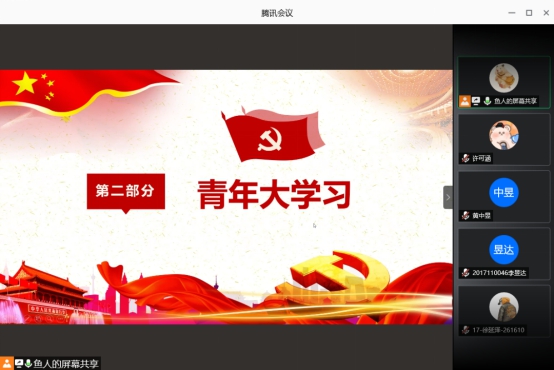 2020年10月17日晚上九点,茅院(电气)2017-01团支部开展了秋季学期“第一堂团课”活动。本次团课茅院(电气)2017-01团支部参与总人数21人,以线上会议的形式展开,学习总共分为三个部分,首先是合唱共青团团歌,接下来是集中学习青年大学习,最后关于迎接中国共产党100周年诞辰的学习的讨论。总时长40分钟。
