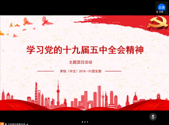 2020年12月11日,茅院(中文)2018-01团支部于线上举行了“学习党的十九届五中全会精神”主题团日活动,本次主题团日活动由团支书方姣棱主持,团支部全体成员参加。