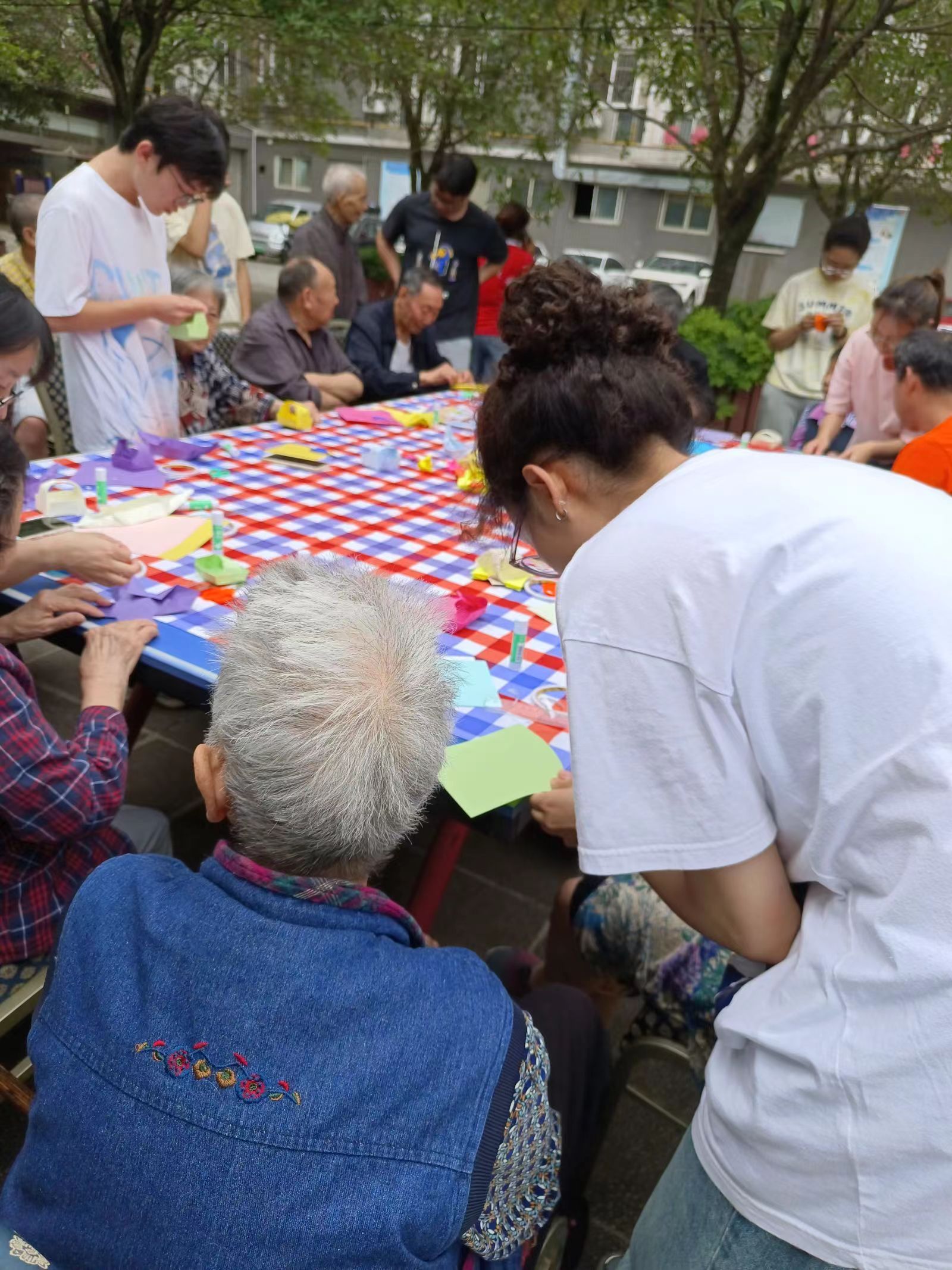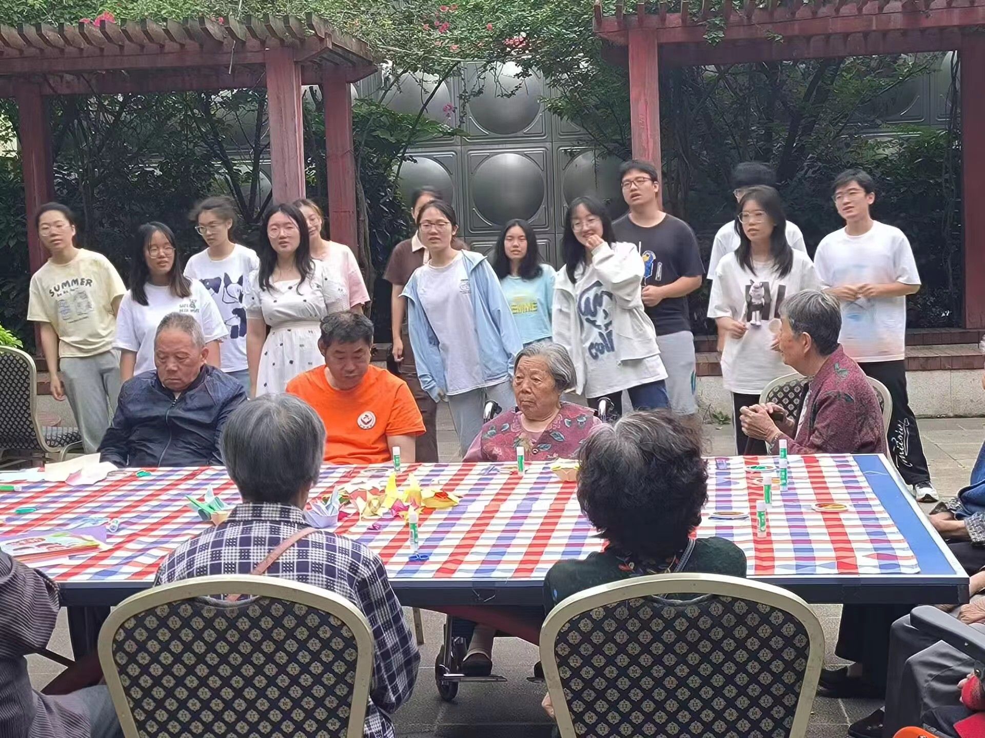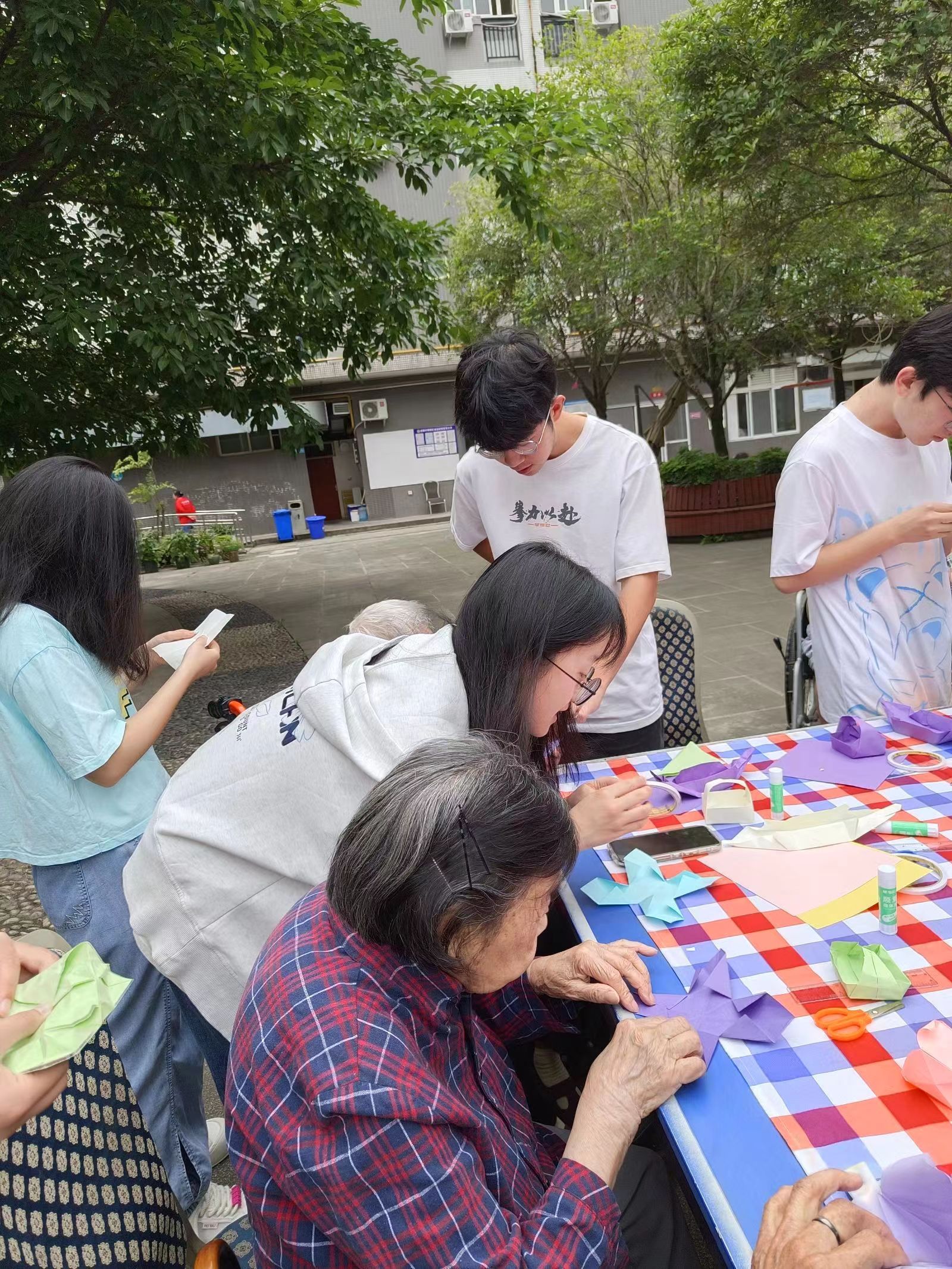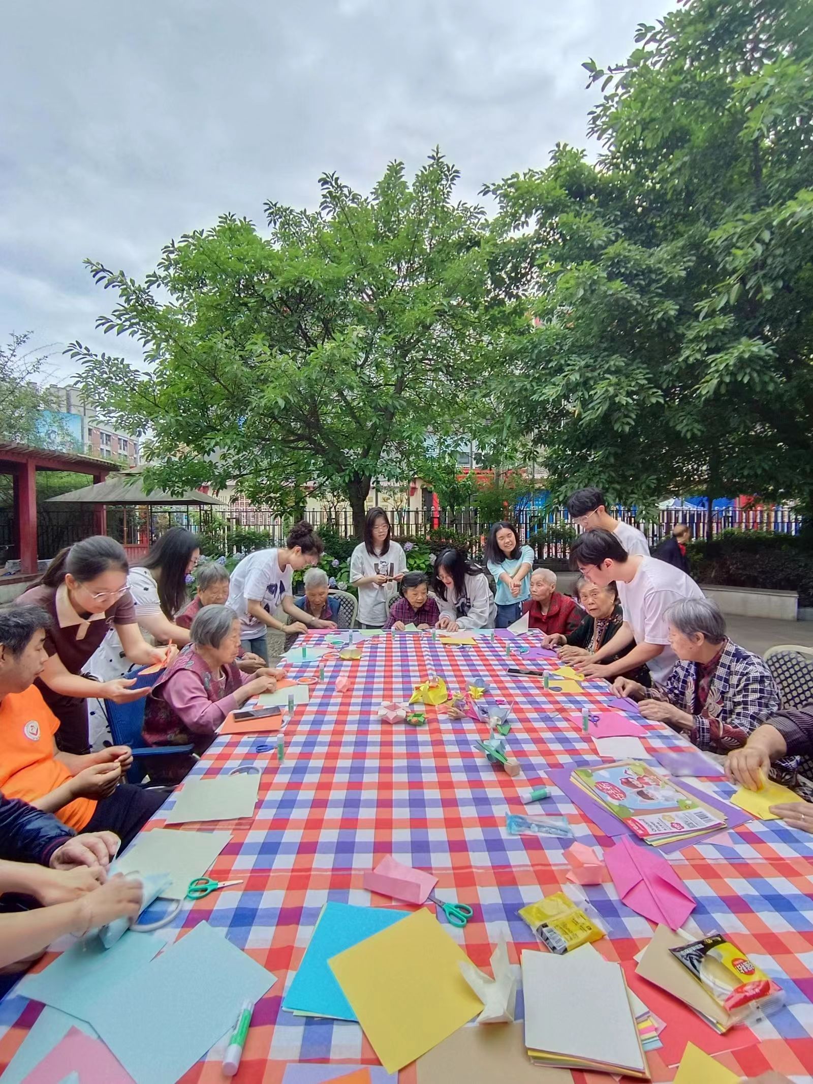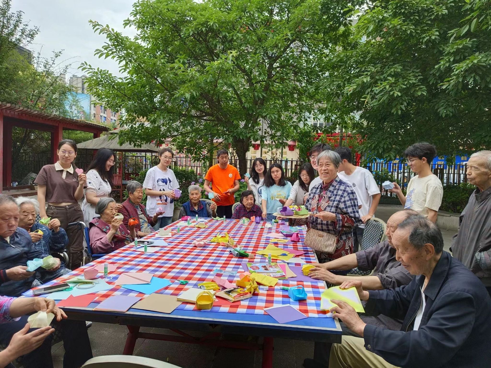 节目表演之后,志愿者们为老人们带来了一场特别的折纸活动。大家拿出提前准备好的各色彩纸,以及折纸所需的工具,为老人们详细展示折纸的步骤。