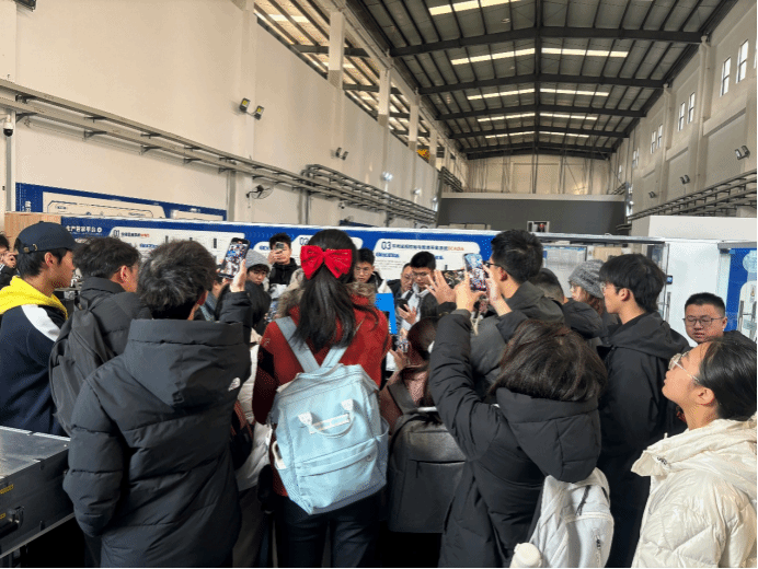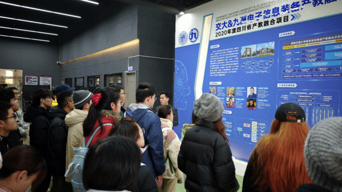 孟老师带领师生来到了实验室的“交大&九洲电子信息装备产教融合示范基地”大门前,为同学们讲解了交大产教融合项目的发展历程和“三个人才特区”培养理念,让师生对产教融合有了初步认识。在AGV协作机器人的展示柜台,孟老师阐述数字化车间柔性生产的组织方法,并介绍地面上粘贴小小二维码的大用处。同学们在讲解中积极发问、热烈响应,展现了精勤求学的学习风气。