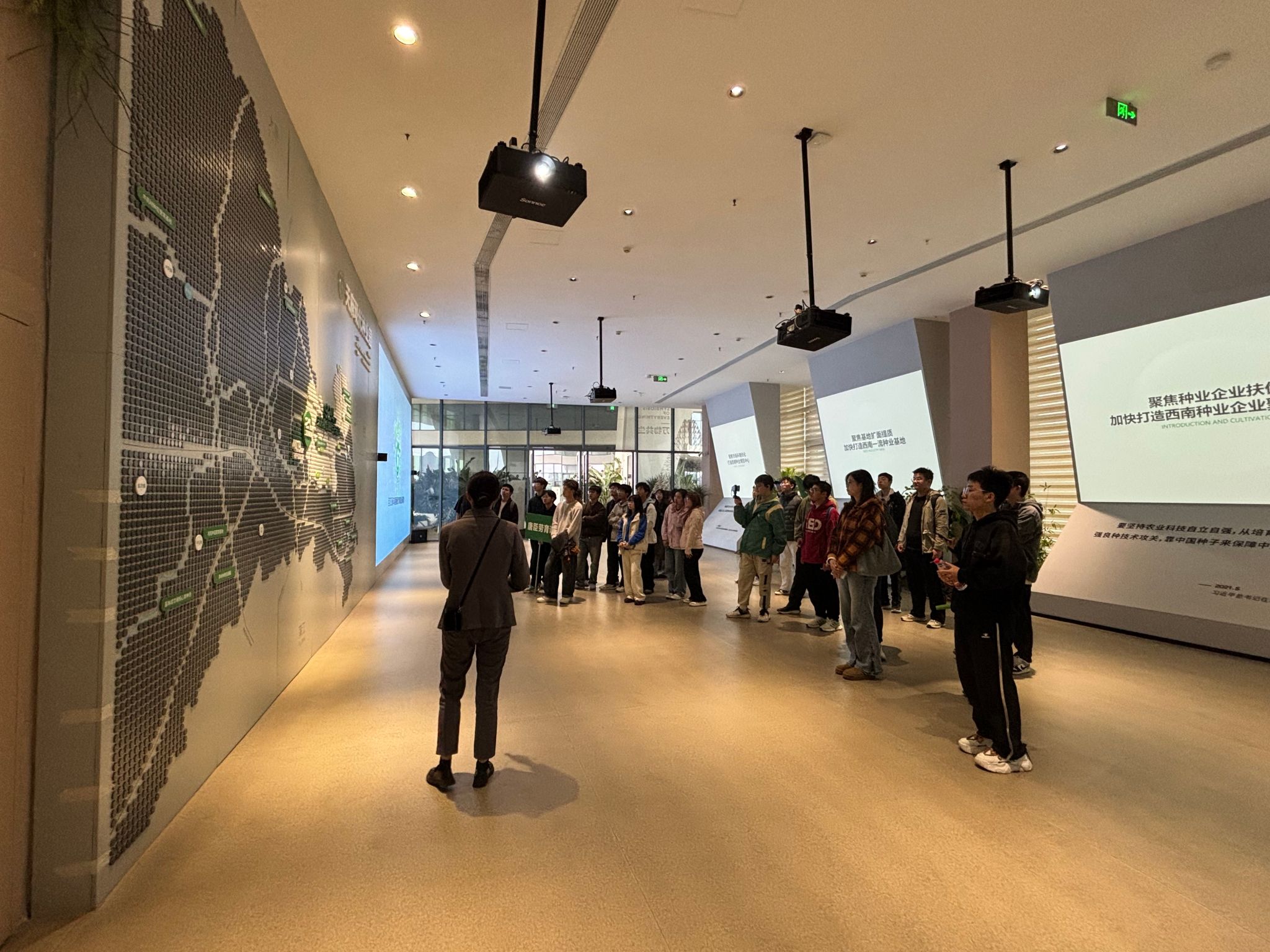 万物共生厅内,通过观看园区宣传片,师生们系统学习了园区整体布局、未来发展规划以及为推动种业振兴实施的五大行动,对园区的战略定位有了清晰认知;
