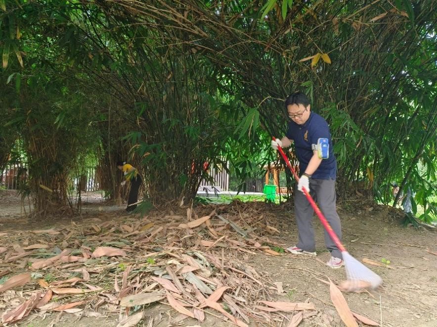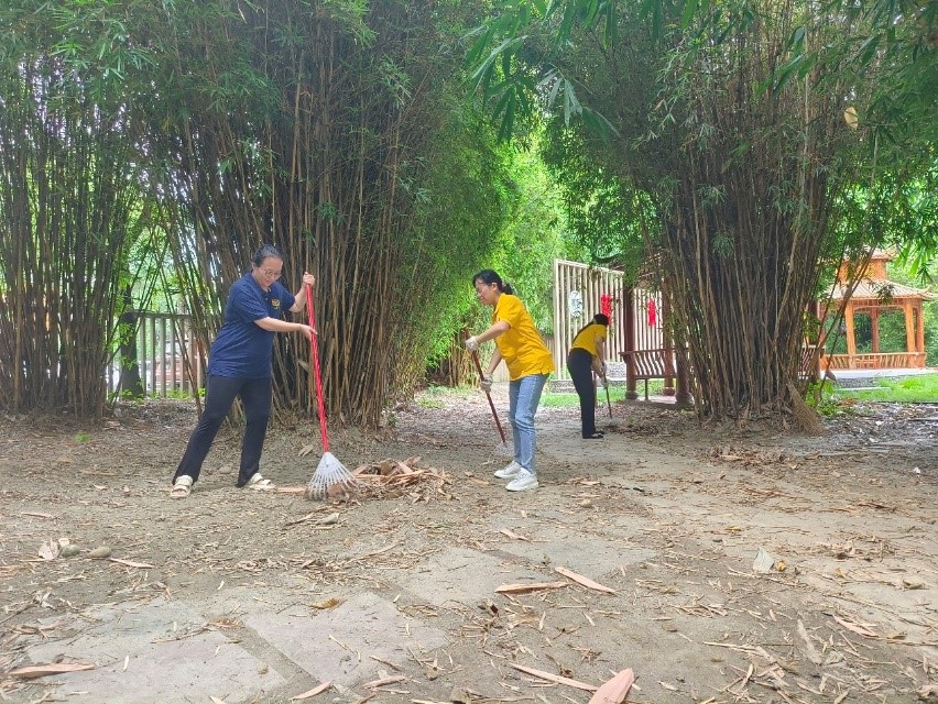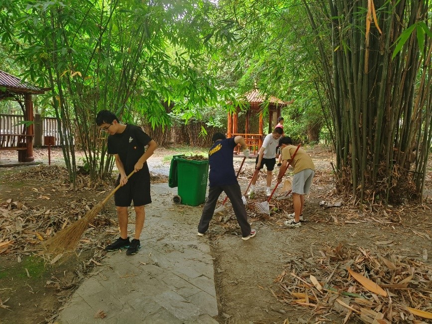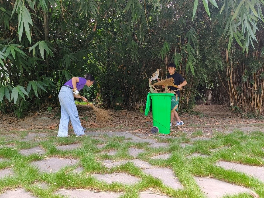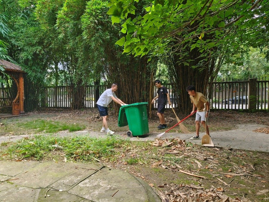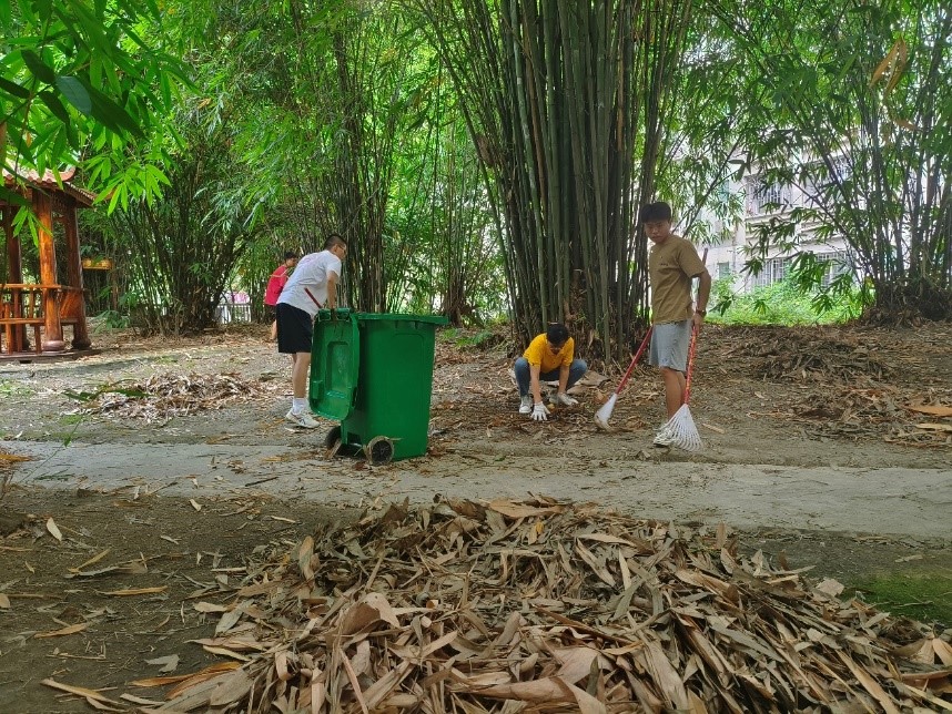一个暑假的风吹雨打,筑梦园内竹林落叶层层堆积,还有个别不讲公德的人随意丢弃的各种垃圾。每位党员同志都热情高涨、干劲十足,不怕累、不怕脏、不怕蚊虫叮咬,耙草、扫地、清运,工具不够用手捧、右手累了换左手,天气炎热汗流浃背,没有一位党员同志停下休息,没有一位党员叫苦叫累,只为了能将筑梦园尽量打扫干净,为同学们提供一个干净舒适的学习、休憩的环境。